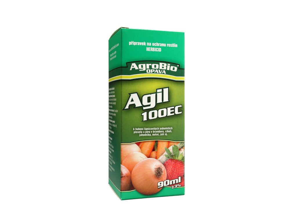SElektivní postřik na plevele určený k postemergentnímu hubení plevelů, jednoděložných jednoletých a vytrvalých plevelů v cukrovce, bramborách, lnu, hrachu, řepce ozimé i jarní, jeteli, vojtěšce, sóji, jahodníku, rajčatech, cibuli, zelí, paprice, mrkvi, petrželi, slunečnici, bobu, pelušce, kmínu, svazence, hořčici, máku, sadech, lesních kulturách a lesních školkách. Obsah: Propaquizafop 100 g/l Pýr plazivý, čirok halepský a ostatní víceleté trávovité plevele jsou citlivé od fáze 3. listu do stádia sloupkování, tj. pýr plazivý při výšce 15-25 cm, čirok 30-40 cm. Ježatka kuří noha, béry, prosa, chundelka metlice a ostatní jednoleté trávy jsou nejcitlivější od fáze 3. listu do začátku odnožování trav. Raná vývojová stádia jsou citlivější než stádia od konce odnožování. Při postřiku pýru plazivého se musí zachovat kultivační klid minimálně 3 týdny, aby došlo k dokonalé translokaci postřiku do odénku pýru. Ošetřené plevele přestanou růst během 3-4 dnů po postřiku.Uhynutí celé rostliny během 10-20 dnů. Postřik se provádí max. 1x za vegetační sezónu. Déšť 1 hodinu po postřiku nesnižuje účinnost. AGIL 100 EC nemá reziduální účinky na následné plodiny. Spolehlivý účinek i za nízkých teplot. Registrované použití postřiku proti plevelům AGIL 100 EC: Brambor, cibule, hrách, jahodník, mrkev, paprika, rajče, slunečnice, svazenka vratičolistá, zelí, peluška: plevele lipnicovité jednoleté: 5–8 ml/4 l vody/100 m2, postemergentně na vzešlé plevele Jetel,vojtěška: pýr plazivý: 12–15ml/4 l vody/100 m2, postemergentně, OL 21 Jetel, vojtěška: plevele lipnicovité jednoleté: 5–8 ml/4 l vody/100 m2, postemergentně, OL 21 Špenát: plevele jednoděložné jednoleté: 0,5-0,8 l/ha, 100-400 l vody/ha, postemergentně, OL 14 dníDoplňkové parametry