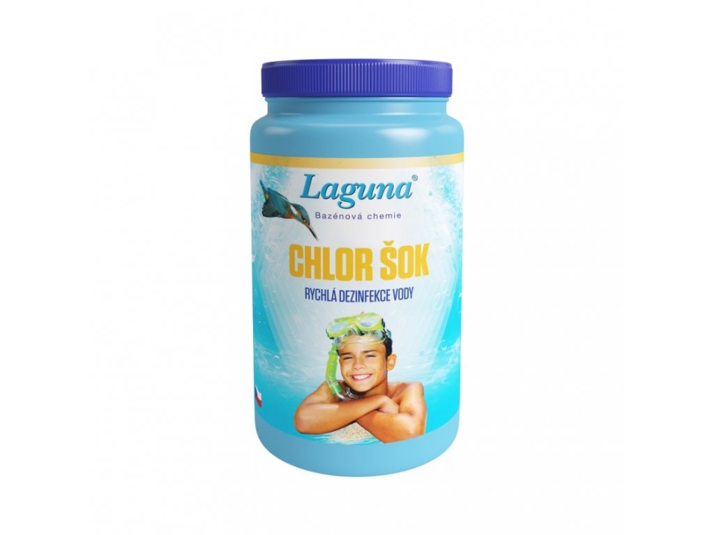 Laguna chlor šok 1kg.Přípravek je určen pro šokovou (rychlou) dezinfekci bazénové vody, při uvedení bazénu do provozu, při extrémních podmínkách provozu bazénu (vysoké teploty, velký počet koupajících, bouřkové počasí apod.). Použití: Chlorové přípravky uvolňují chlor, dochází k dezinfekci bazénové vody a likvidaci přítomných mikroogranismů (řas, bakteriií, virů). Každý koupající přináší do bazénu nečistoty z pokožky, použitých opalovacích kremů. Současně do bazénu napadají nečistoty z vnějšího prostředí (prach, pyl, výtrusy apod.). Veškeré nečistoty podporují tvorbu bakterií a řas, z toho důvodu je nutno dbát na pravidelnou dezinfekci. Návod k použití: Přípravek se dávkuje přímo do bazénu po rozpuštění ve vědru nebo do sběrače (skimmeru) při zapnutém filtračním zařízení. Vydatnost: Při napuštění bazénu rychlá škoková dávka - 10 g/m3 vody (1 rovná polévková lžíce). Při pravidelném provozu - 5 g/m3 vody (1 kávová lžička).Doplňkové parametry