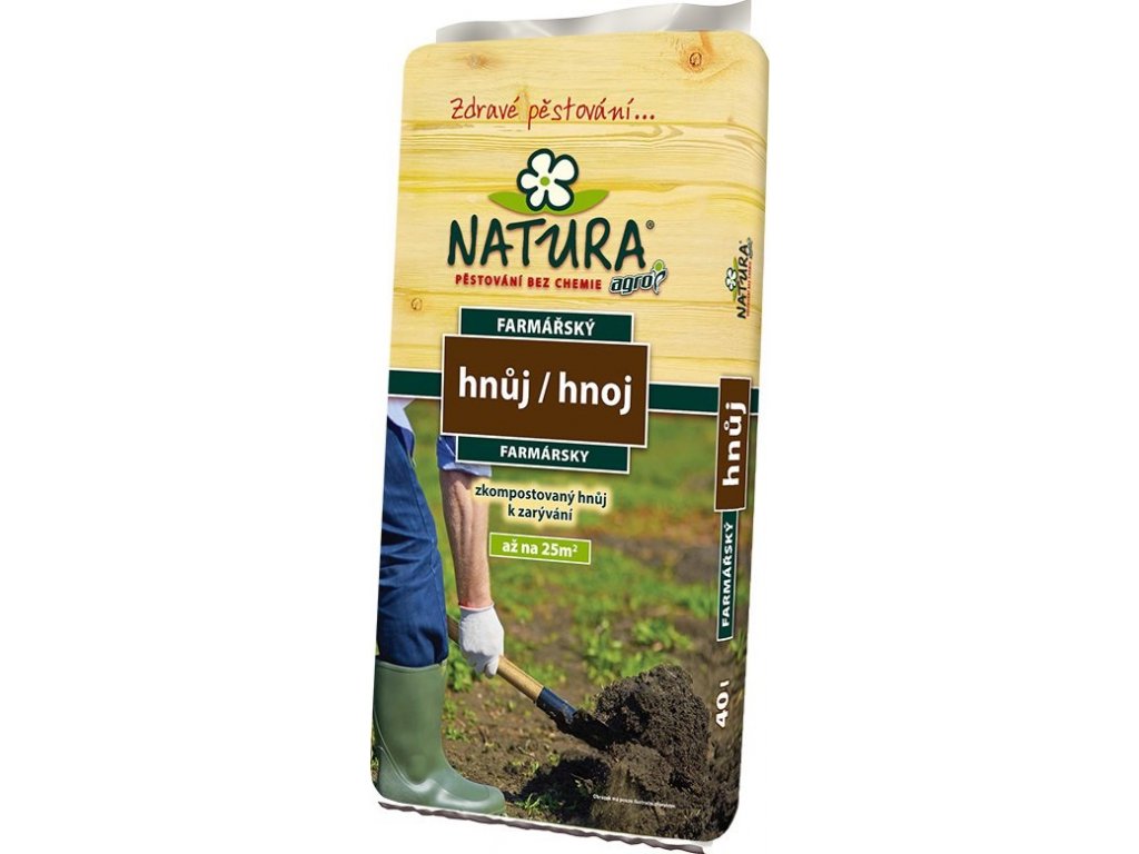 NATURA Farmářský hnůj 40 l je tradiční organické hnojivo s vysokým obsahem přirozeně se vyskytujících živin a organických látek. Neobsahuje žádné látky chemického původu. Vyrábí se zkompostováním hnoje a jiných organických látek rostlinného původu. Samotná organická hmota vylepší strukturu, mikrobiologický život a vodní režim půdy. Zvyšuje úrodnost půdy přírodní cestou bez chemie.