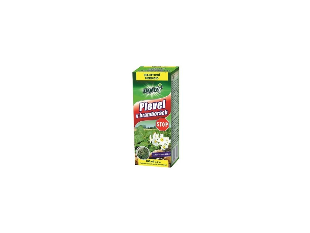 Plevel v bramborách STOP je účinný selektivní systémový herbicid určený k hubení plevelů v bramborách. Přípravek působí na dvouděložné plevele jednoleté (merlík, heřmánkovité, pletka, kokoška pastuší tobolka, lilek, svízel, violky, rdesno) a plevel ježatka kuří noha. Přípravek: ARCADE 880 EC. Aplikuje se postřikem těsně před vzejitím.Doplňkové parametry